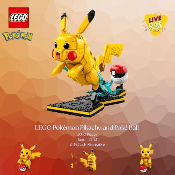 Relive Trainer memories with the Pikachu and Poké Ball (72152) building kit. Construct this piece of gaming room decor and capture that feeling when you first went into battle with this cute Pokémon by your side. A gift for adults who love cute gaming accessories and video game merch, this 2050-piece LEGO® set is packed with Pokémon details. A colorful piece of gaming room decor, this yellow Pikachu model, with its black ear tips and red cheeks, has a tail that can be built to show it in male or female version. Other iconic details include lightning sparks symbolizing the energy stores of this Electric-type Pokémon and the “25” incorporated on the display base as a nod to Pikachu’s Pokédex number. The posable figure can be displayed in adynamic battle stance launching from the opened Poké Ball, which can also be displayed closed when the Pikachu figure is in resting pose.